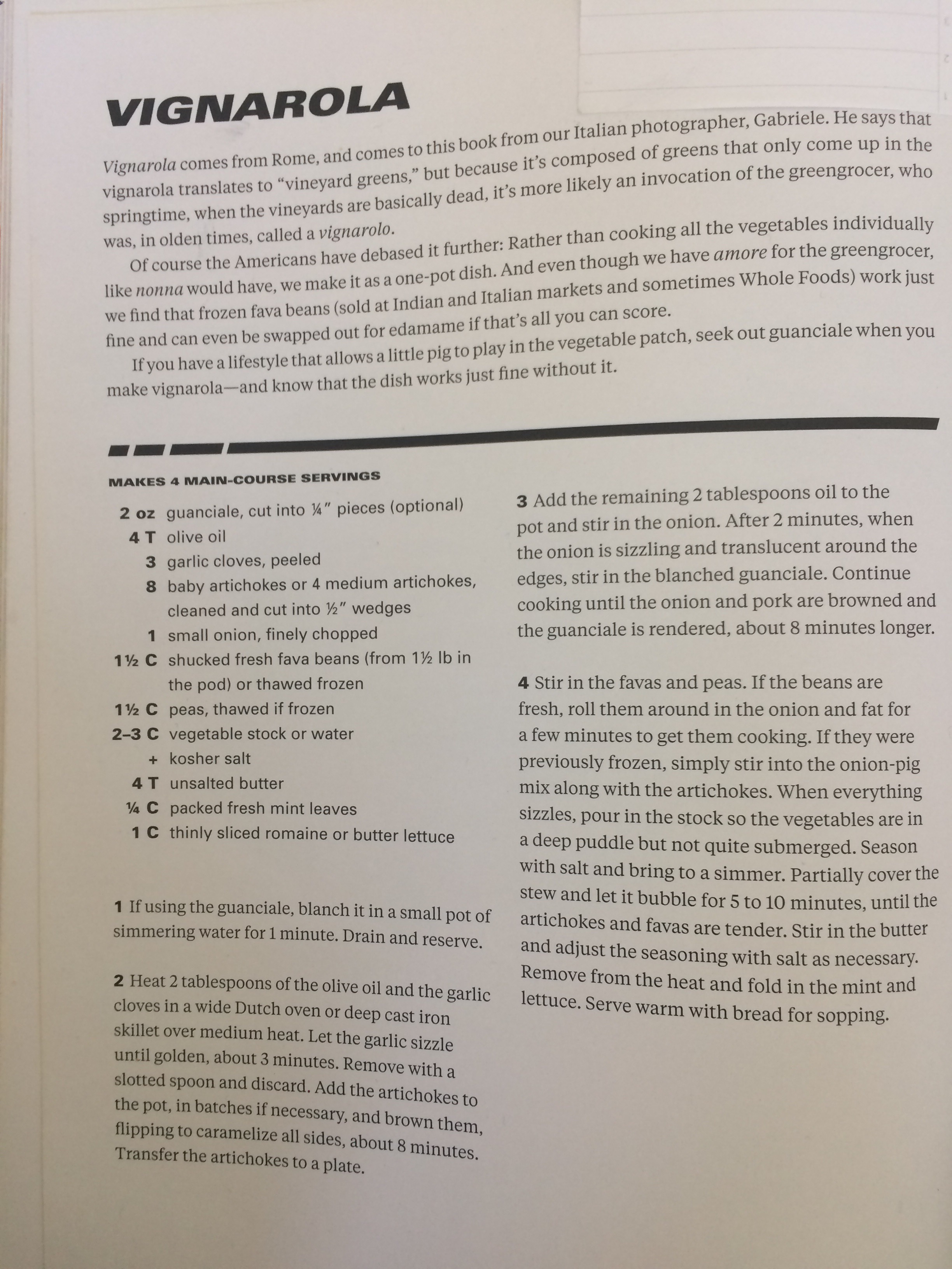 Notes: Used frozen Lima beans as we couldn’t find fava beans Used canned artichokes Used pancetta (didn’t blanch it)